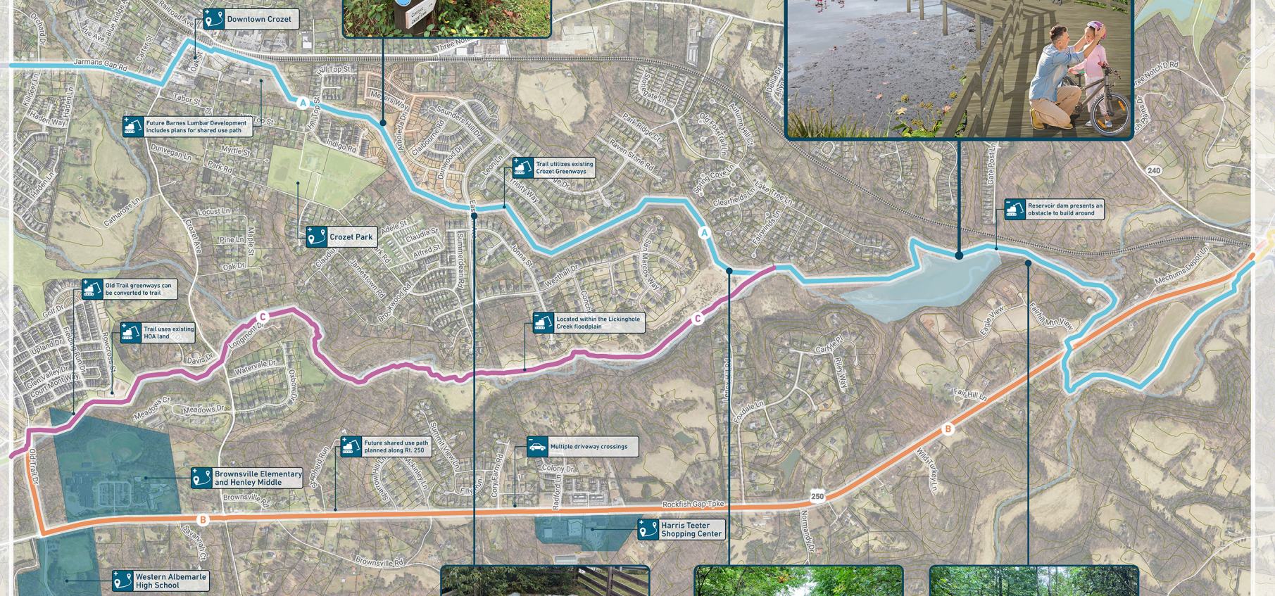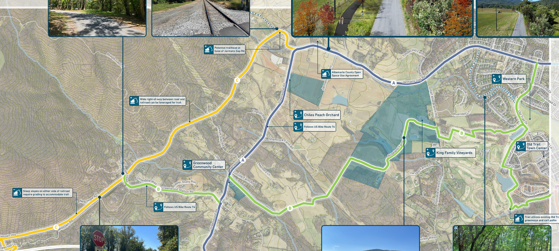 At first, I was really drawn to route A, passing right through downtown Crozet. Having a regional shared-use path run right through the actual heart of Crozet sounds like a great idea.