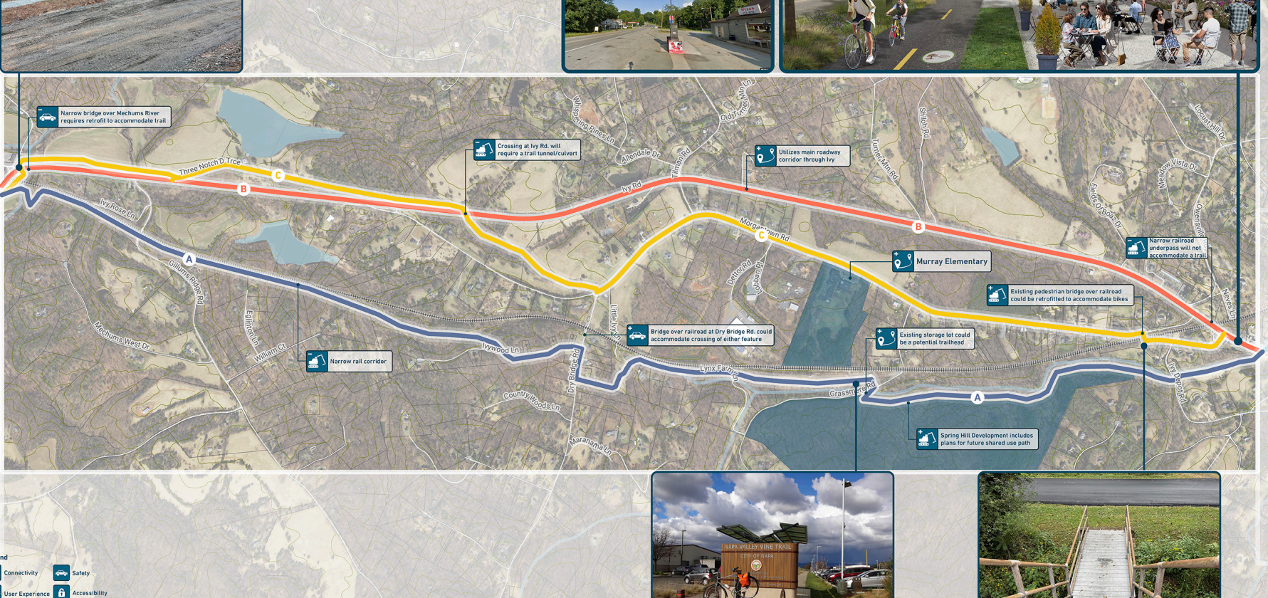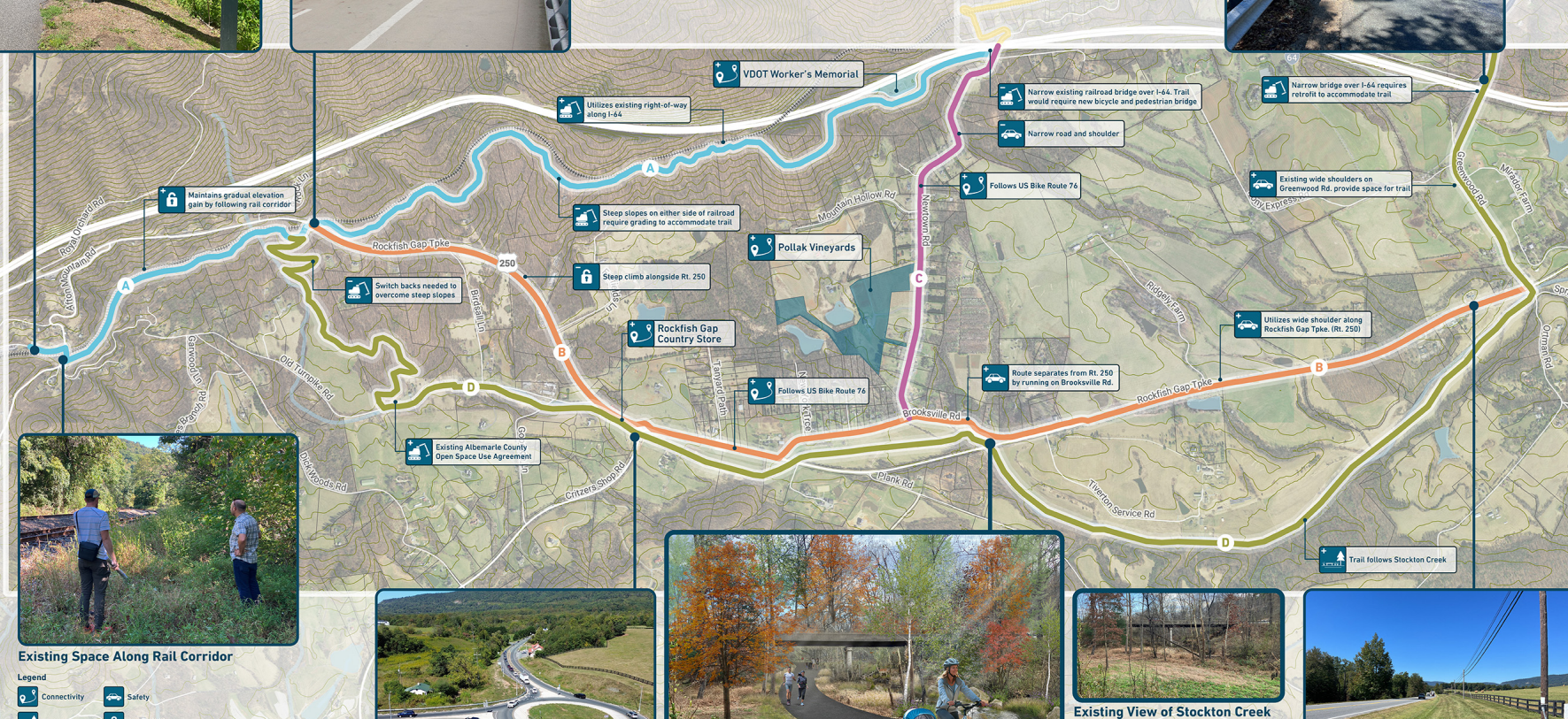 At last! Route options for the Three Notched Trail are out now for public feedback. I've had a few days to mull on them since the public meeting where they were presented. You can view the maps in the wacky virtual room space here: https://app.seekbeak.com/v/AQjQxwZ7zkD