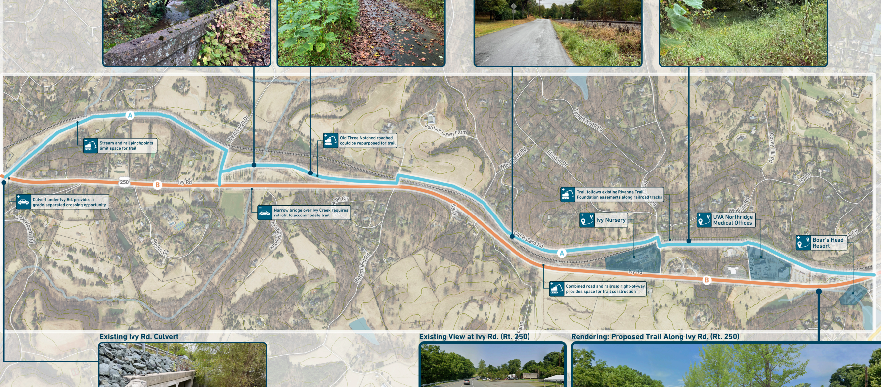 With that said, I do see a lot of value in following 250 - route B, the orange route. And whatever happens with this segment, I'd love to see this as a way to reinvigorate the Toddsbury of Ivy site and draw people towards the new storefronts over there near the post office. That whole area would be a great stop on a regional shared-use trail.