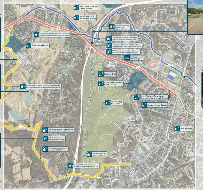 But the more I've thought about it, the more I like route B - the orange route on this map, following route 250 all the way. I think this makes the Three Notched Trail much more viable as a commuting route - an alternative for students at Henley and Western, a straight shot towards Charlottesville for folks getting into the city.